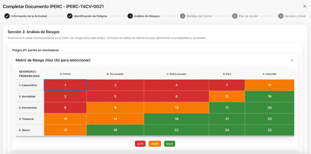 No es un formulario estático; es una matriz inteligente. El sistema guía al usuario en la identificación de peligros según la zona de trabajo.