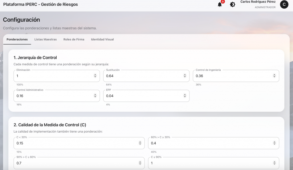 Evaluación de Doble Escala: Calcula automáticamente el Riesgo Inicial y, tras aplicar las medidas de control (jerarquía de controles: eliminación, sustitución, ingeniería, etc.), determina el Riesgo Residual.