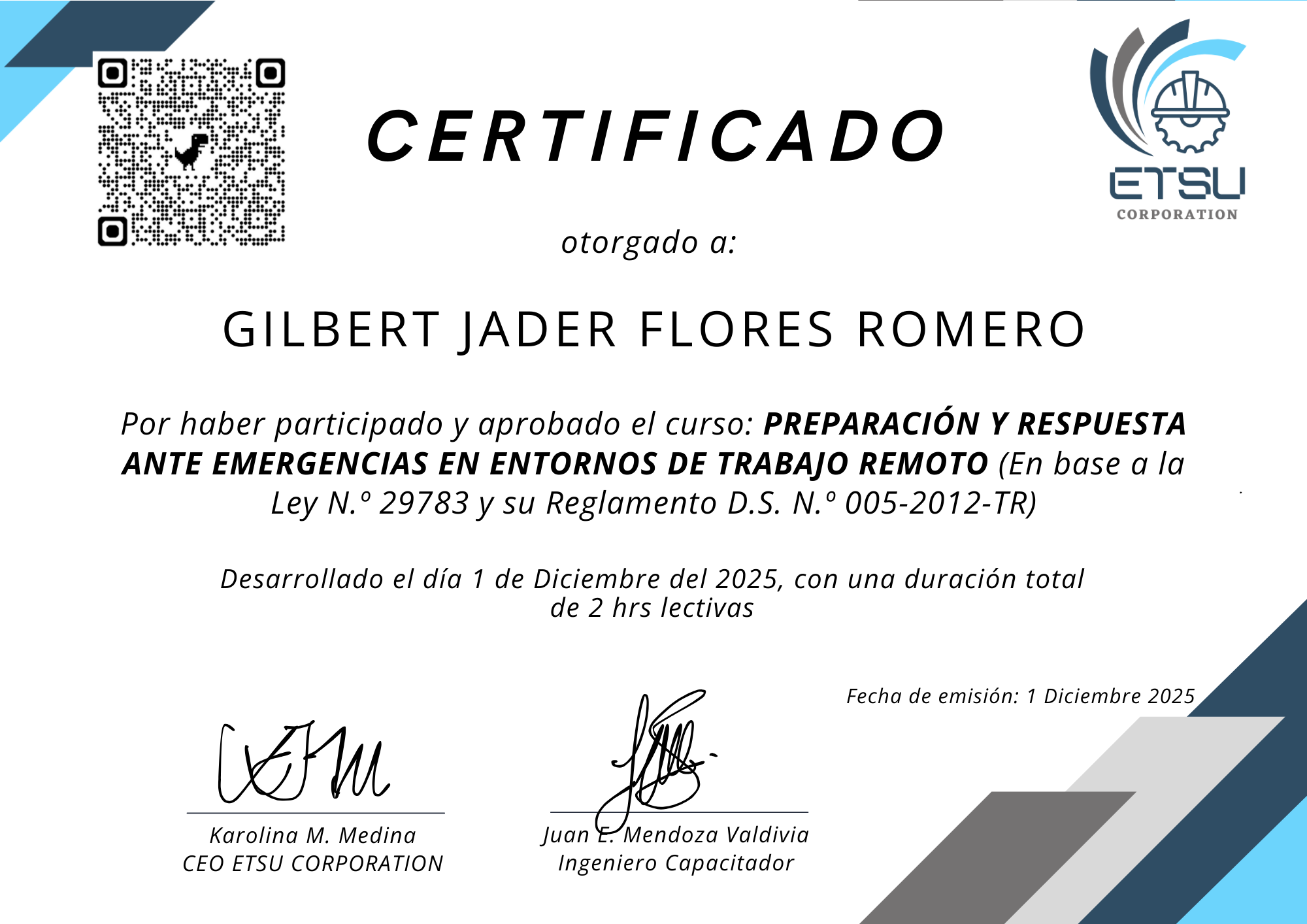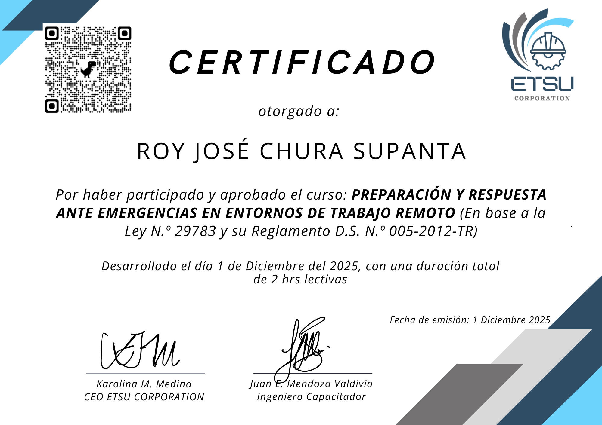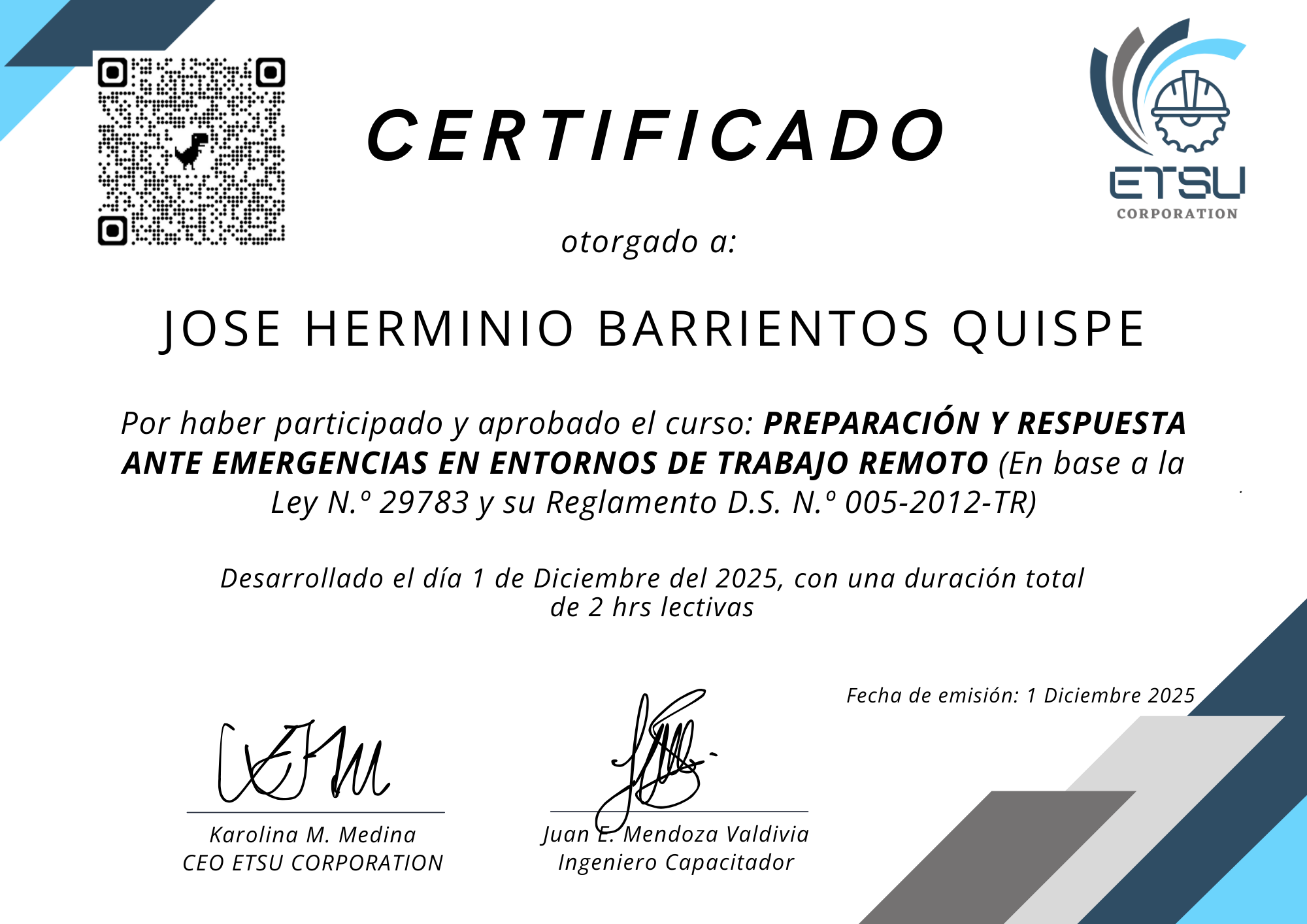 Empresa de TIEn este perfil se muestran los certificados emitidos por ETSU Corporation, los cuales acreditan que los participante ha culminado satisfactoriamente programas de capacitación en Seguridad y Salud Ocupacional. Estos documentos certifican sus conocimientos y competencias en la prevención de riesgos y la construcción de entornos laborales más seguros.