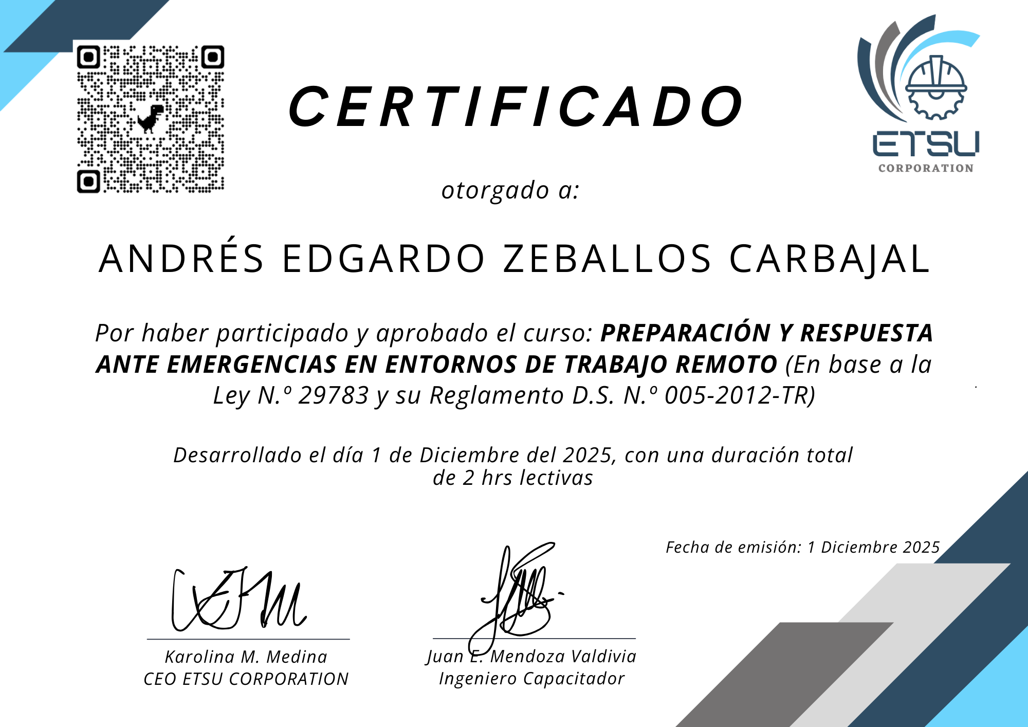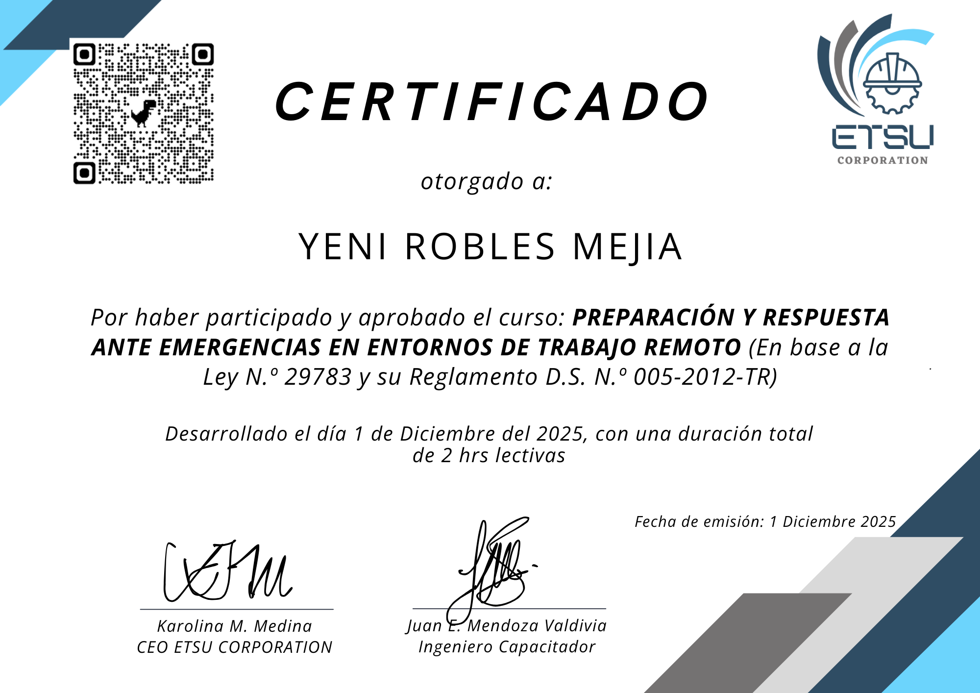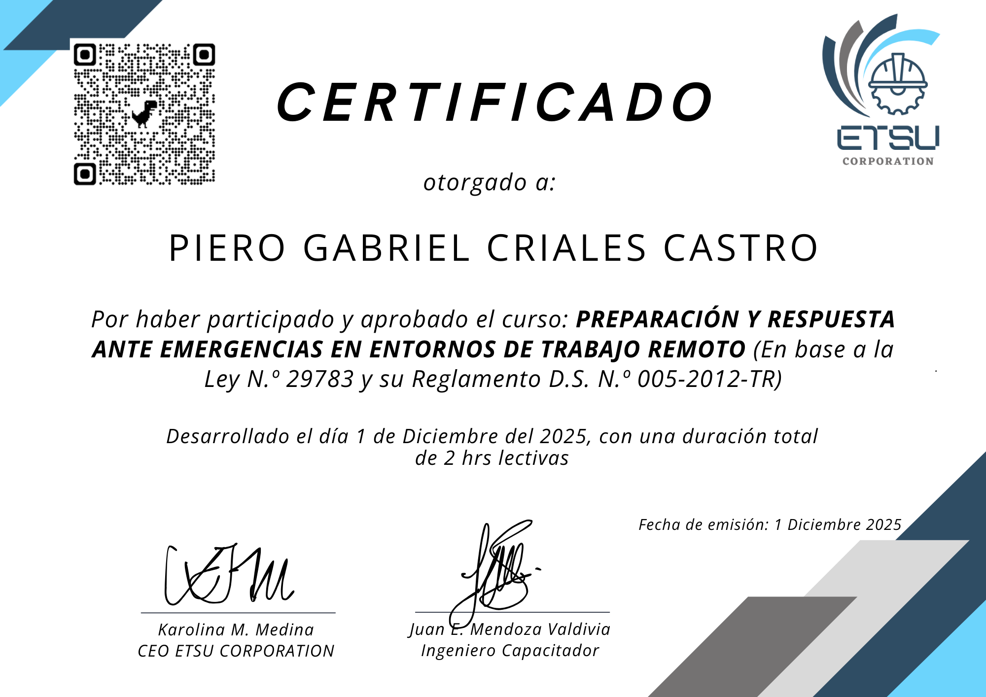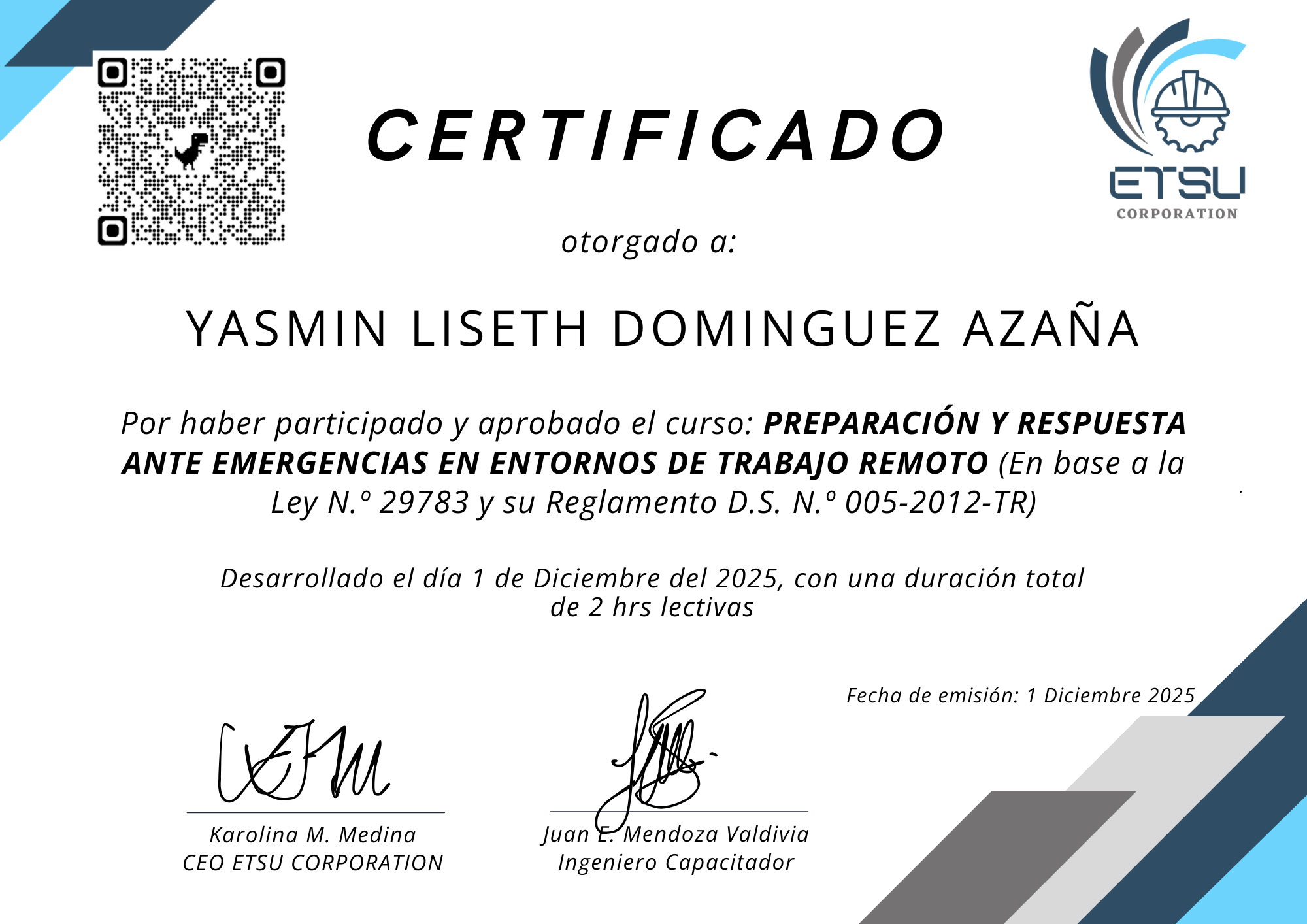 Empresa de TIEn este perfil se muestran los certificados emitidos por ETSU Corporation, los cuales acreditan que los participante ha culminado satisfactoriamente programas de capacitación en Seguridad y Salud Ocupacional. Estos documentos certifican sus conocimientos y competencias en la prevención de riesgos y la construcción de entornos laborales más seguros.